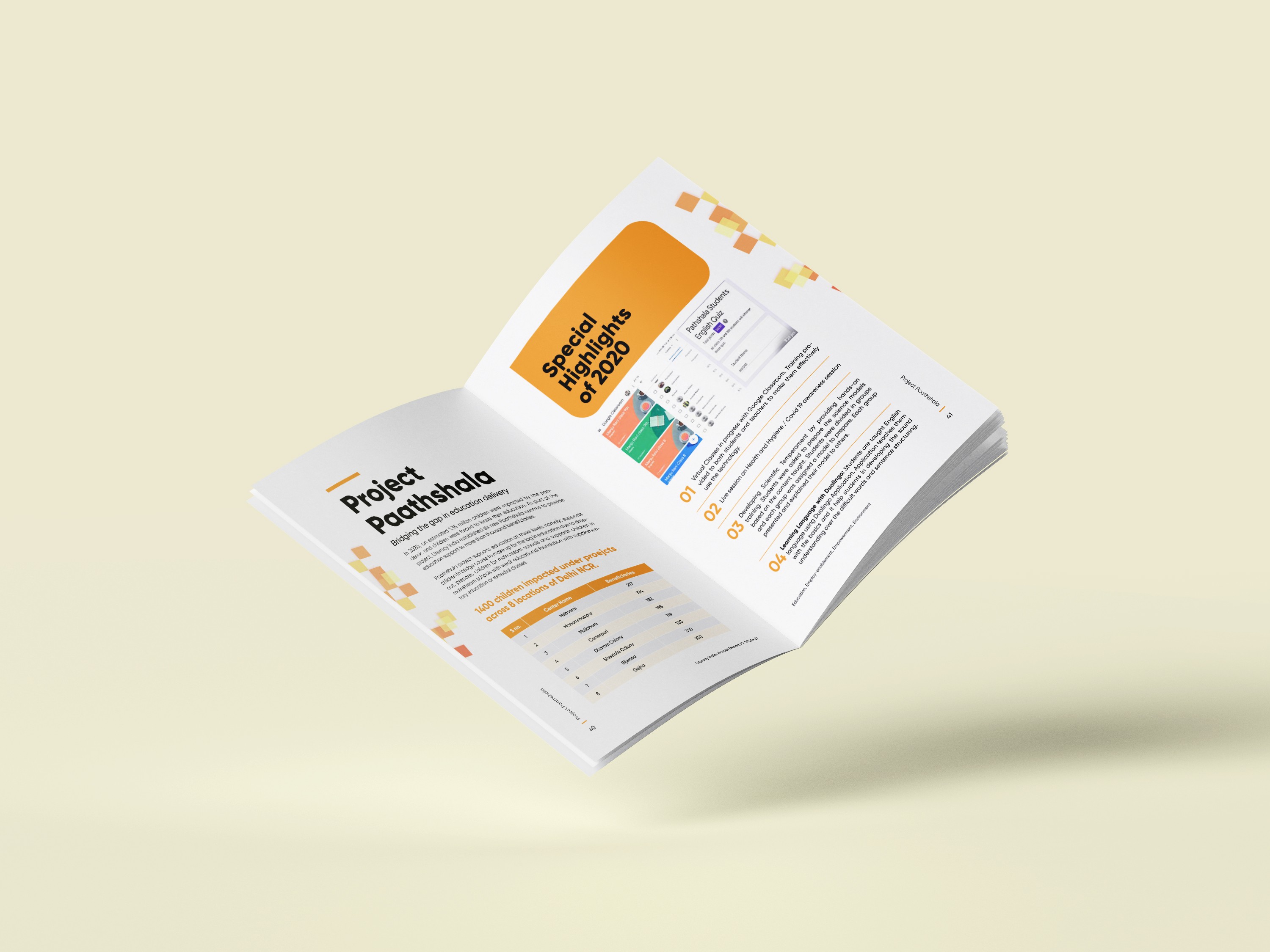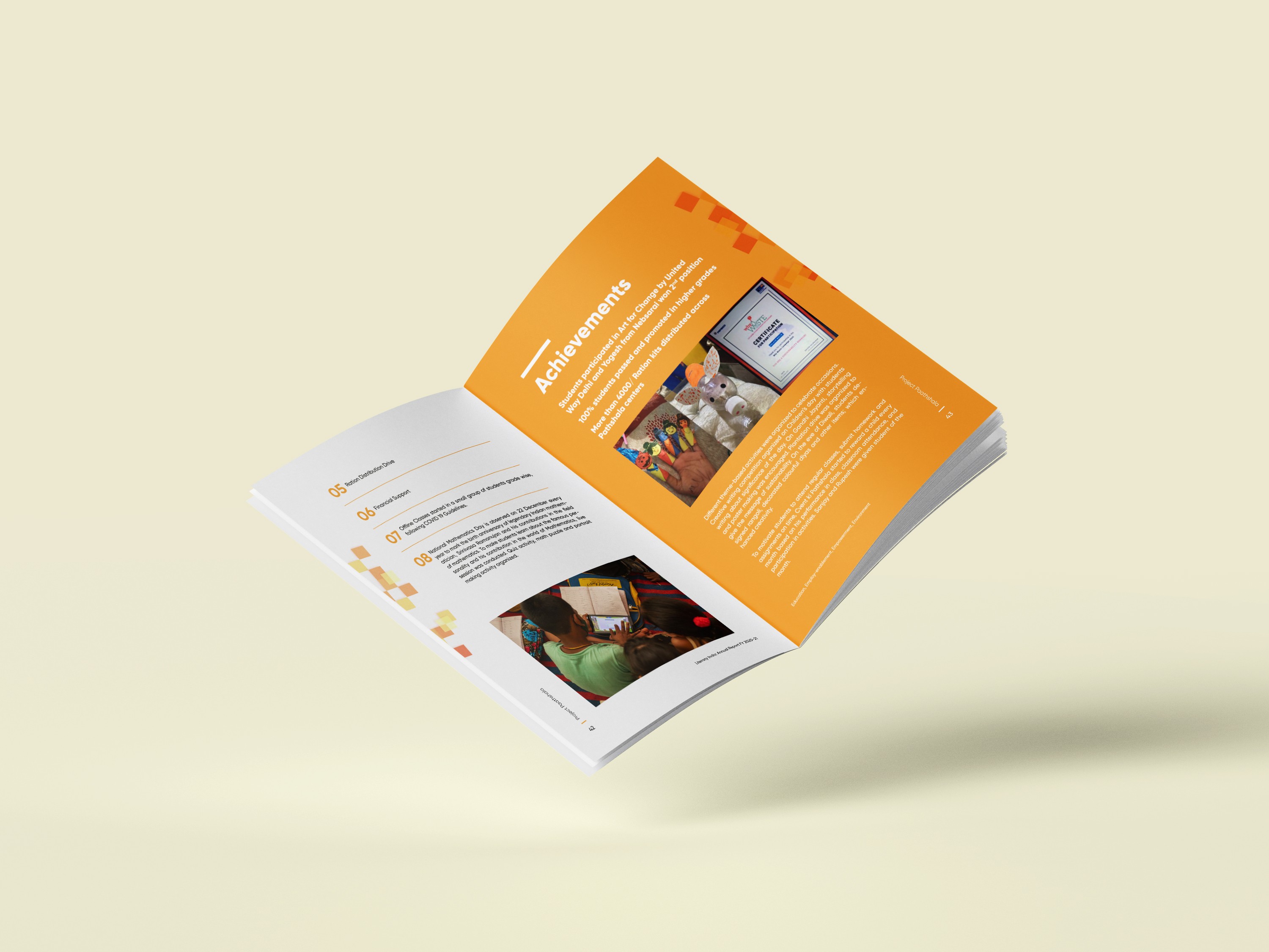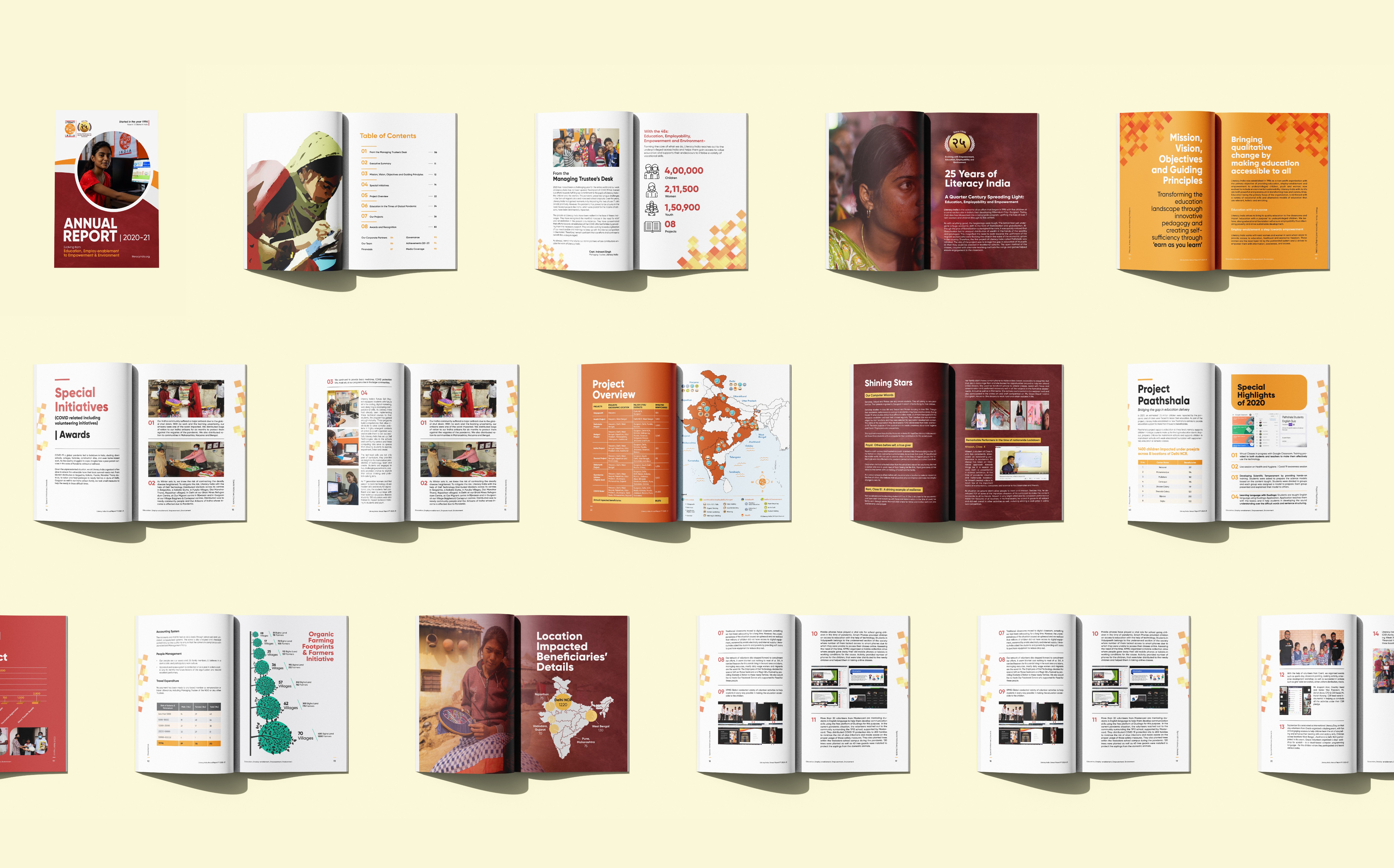 This project was a 99-page annual report for an NGO that delivers value education to underprivileged communities across India. I led the full visual direction - layout design, digital hand-drawn illustrations, infographics, cover design, content editing, and the overall narrative flow.