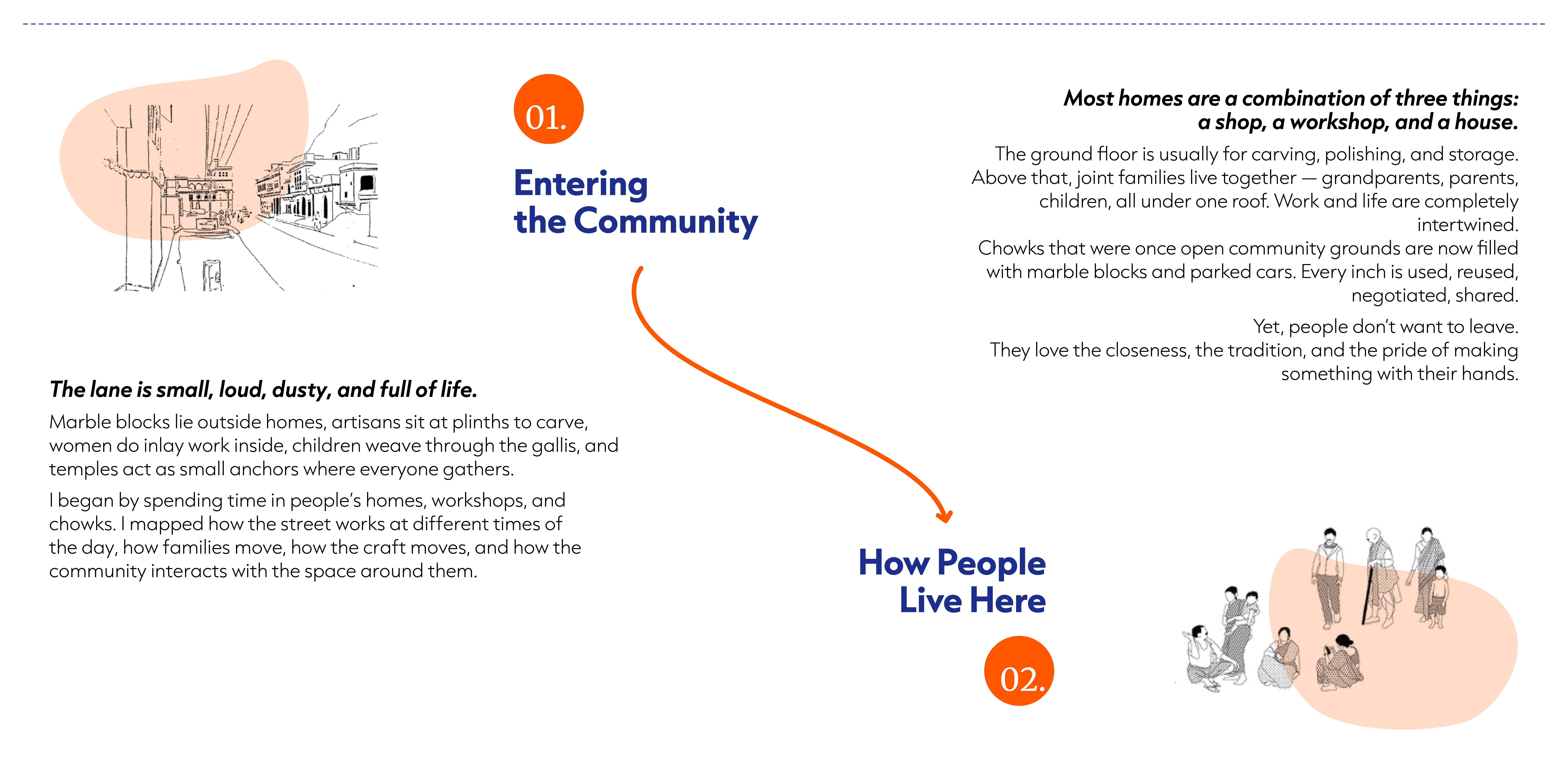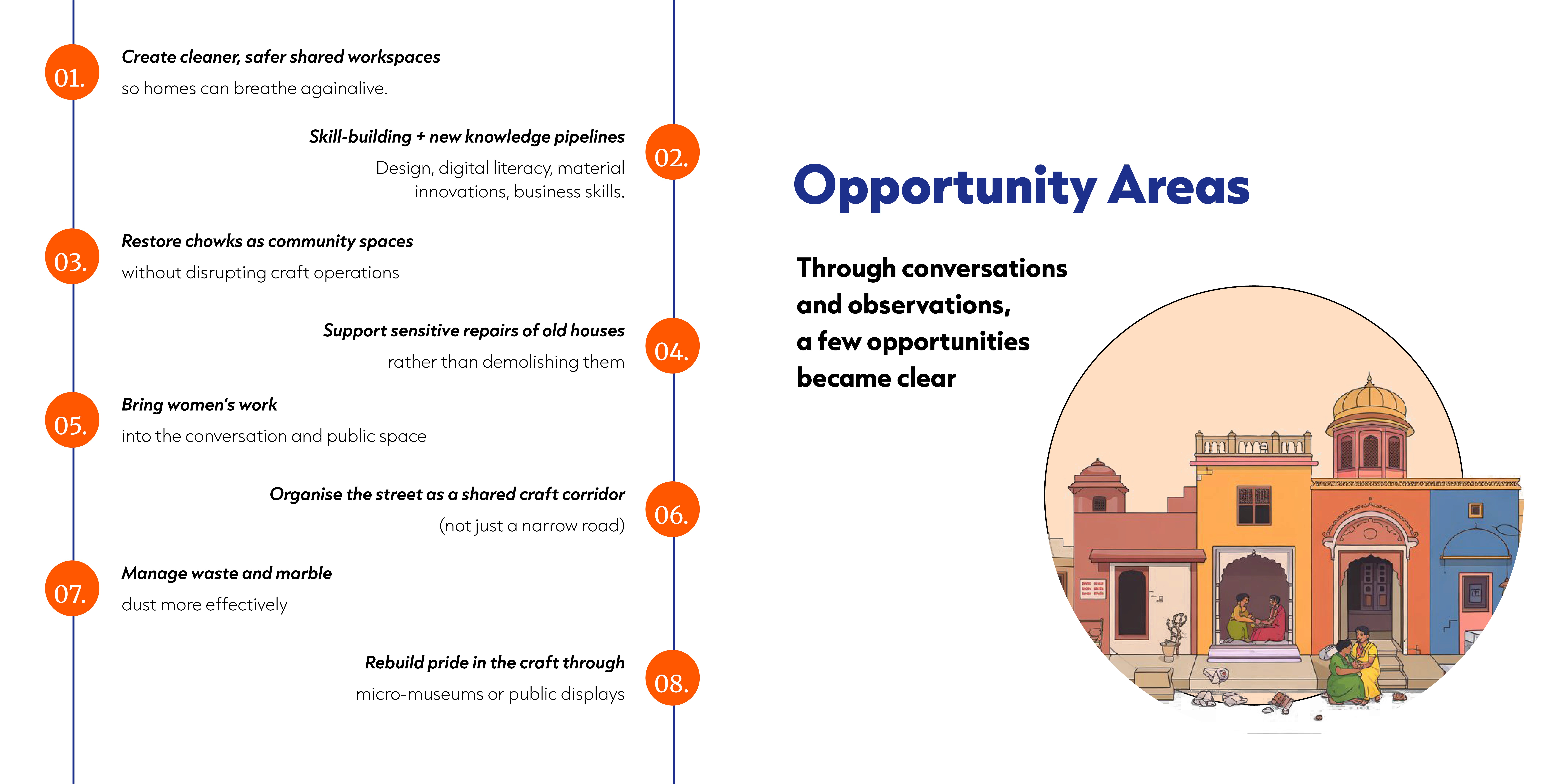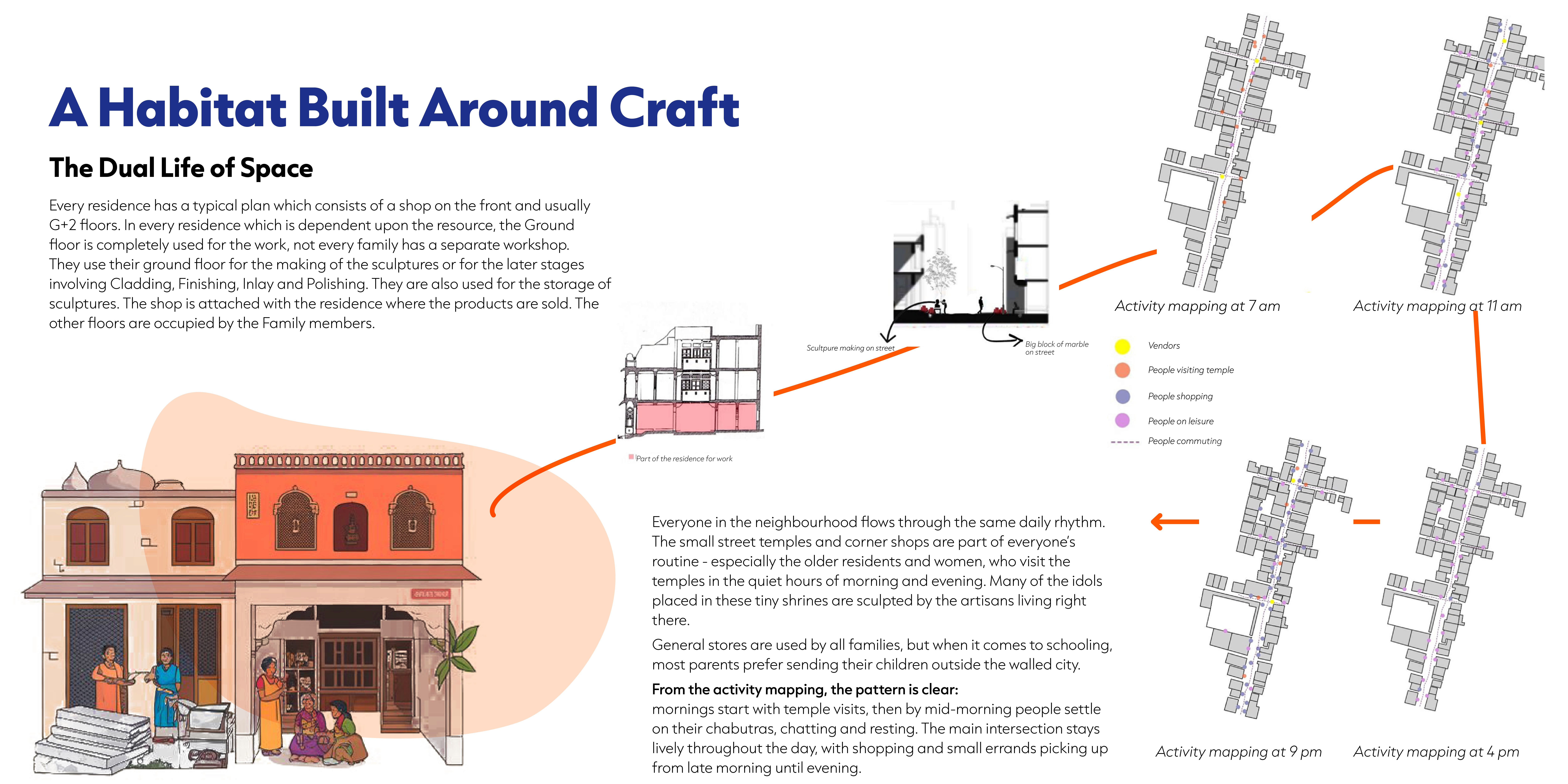 Khazaane Waalo Ka Rasta is a narrow, bustling lane in Jaipur’s walled city. For generations, families here have carved marble idols in their homes - entire households turning raw stone into gods, souvenirs, and heritage pieces that travel across the world. Over time, the craft, the homes, and the street have become inseparable. My role in this project was to understand how people live, work, and share space here - and imagine ways the neighbourhood could grow without losing its soul.